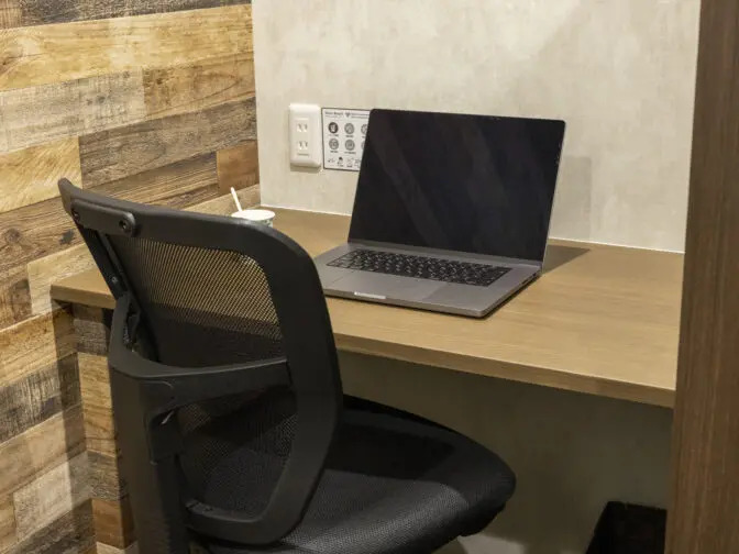 内装はカフェ風の落ち着いた大人の空間で、アンティーク調のデザインが魅力的!日常から少し離れた特別な作業環境を提供しています。また、デュアルモニターが必要な方のために、無料で利用できるモニター付きの作業ブースを提供し、HDMIケーブルを接続するだけで使用可能です!