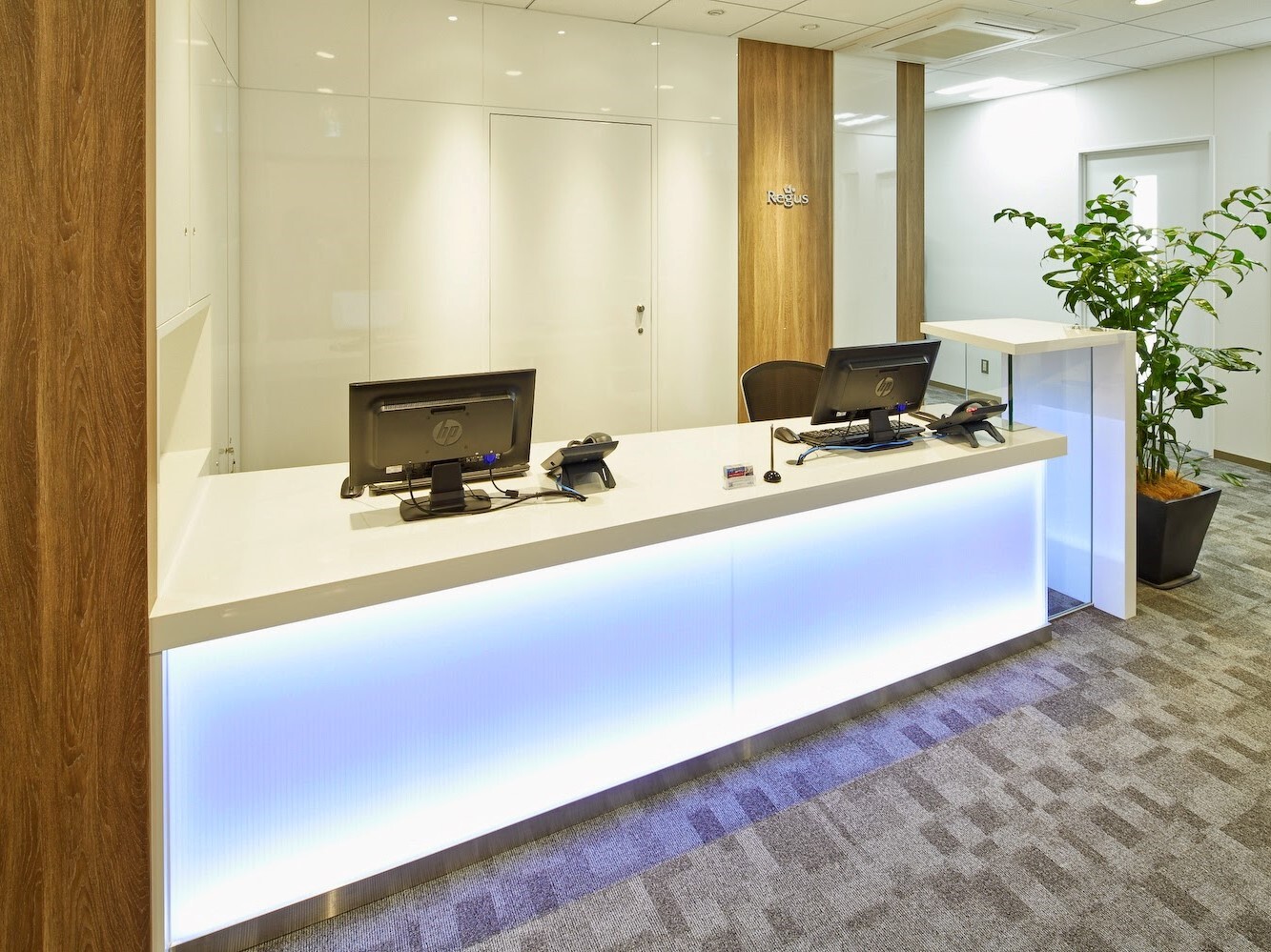 外観_受付。スタッフがビジネスをサポートいたします。気軽にお声がけください。